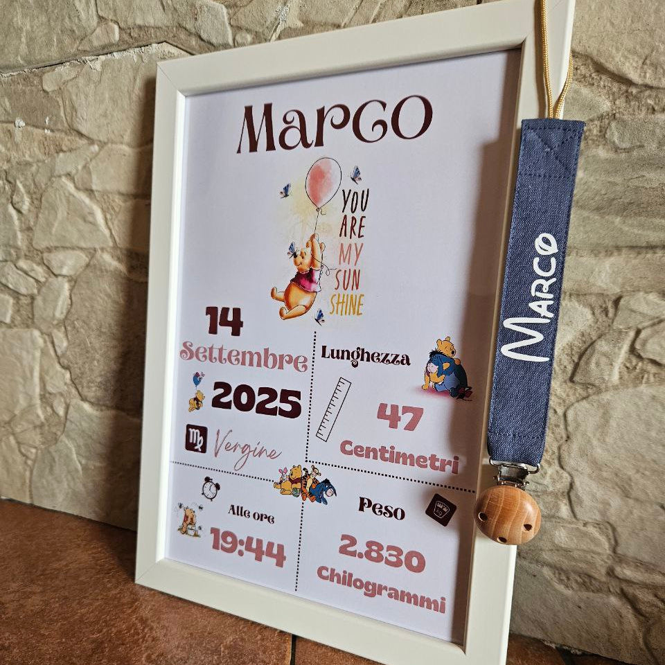 Immagina la gioia di appendere nella cameretta del tuo piccolo una che racchiude nome, data e dettagli della nascita, accompagnata da una catenella portaciuccio ricamata con il suo nome in 100% cotone (6 colori disponibili) , ideale per i primi mesi del neonato. . Non solo oggetti: ma ricordi tangibili che ogni giorno ti faranno rivivere l’emozione più grande.